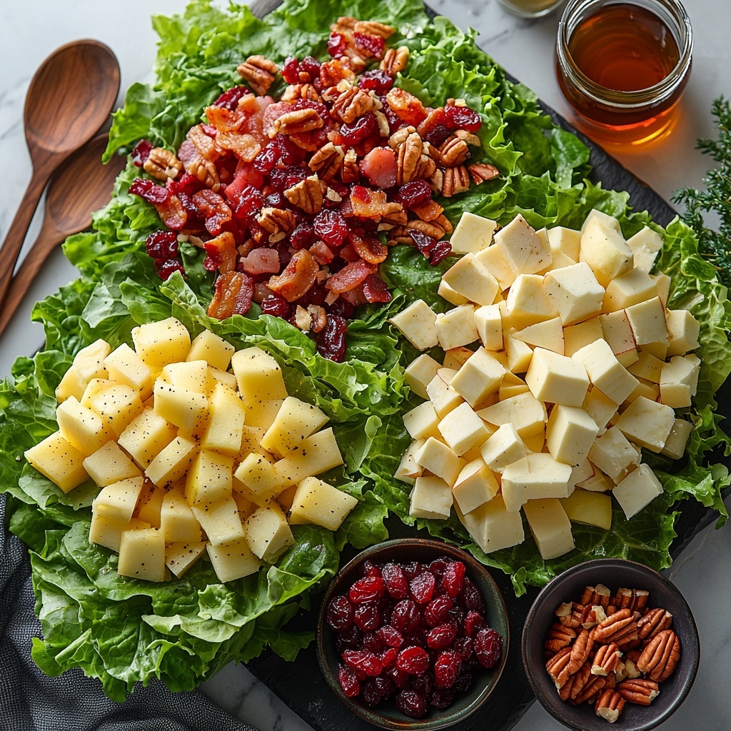 Grab a large mixing bowl and toss together your chopped Romaine or green leaf lettuce, diced apples, dried cranberries, toasted pecans, crumbled bacon, and feta cheese. These ingredients bring together a playful mix of nutty, fruity, crunchy, and creamy elements that define this salad’s charm.