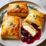 These Baked Cranberry Brie Bites are a delicious and elegant appetizer featuring creamy brie cheese and tangy cranberry sauce wrapped in flaky puff pastry. Perfect for holiday gatherings or any festive occasion, this recipe combines rich, buttery pastry with sweet and tart flavors, finished with a lovely rosemary garnish for a fresh, aromatic touch.