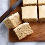 - Frost the bars: Once the banana bars have cooled completely, spread the cream cheese frosting evenly over the top. Cut into 24 squares and serve.
