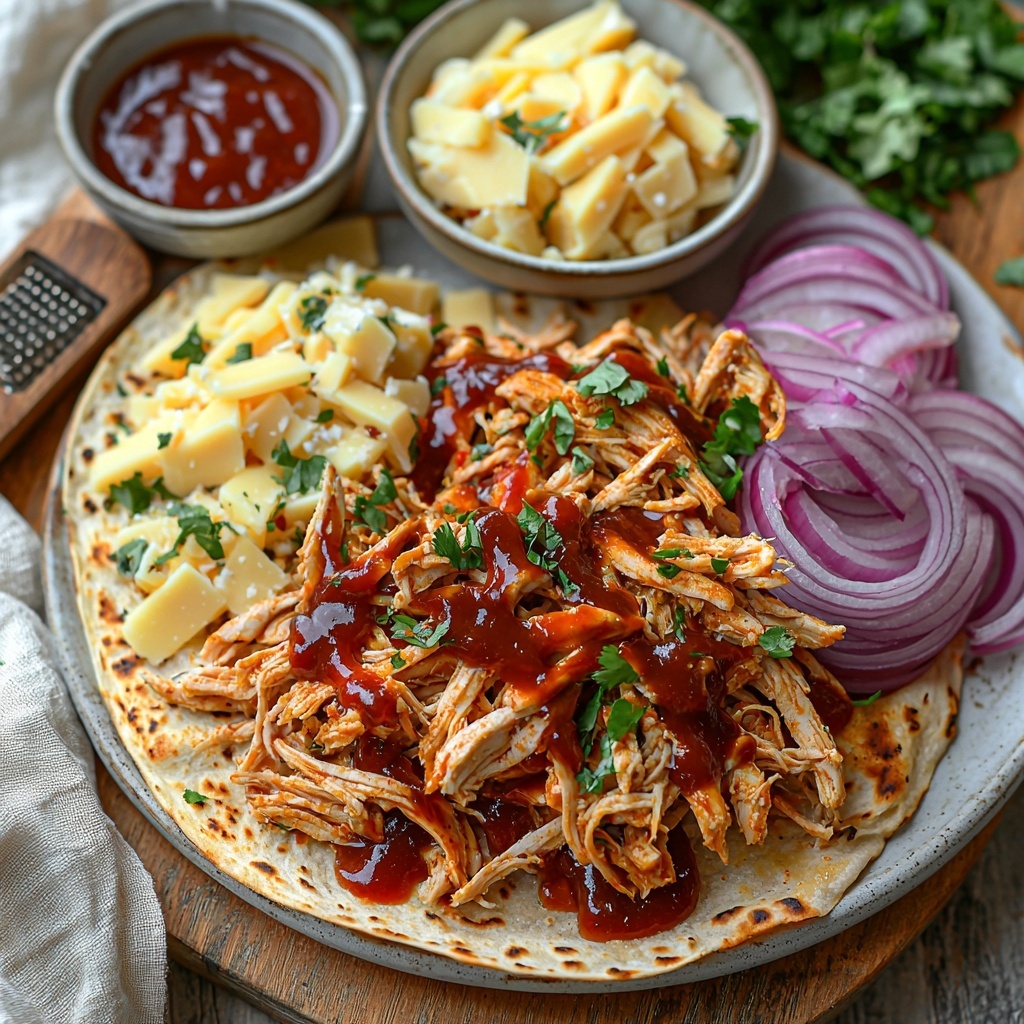- Assemble the Flatbread: Brush the remaining ¼ cup of BBQ sauce evenly over the flatbread. Sprinkle half of the sliced red onion and half of the shredded cheeses (both gouda and mozzarella) over the sauce. Distribute the BBQ-coated chicken evenly on top, then top with the remaining onions and cheeses to create a deliciously layered effect.