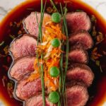 - Assemble the Tataki: Arrange the sliced beef on a serving plate, drizzle generously with the yuzu dressing.