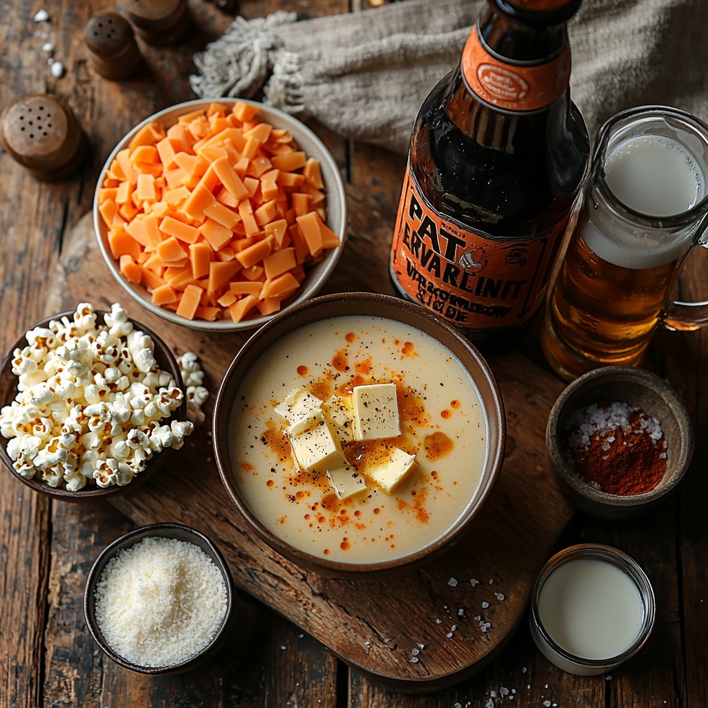 While this Beer Cheese Soup Recipe shines on its own, the right garnish adds a delightful textural contrast and visual appeal. Popcorn is an unexpected, fun topping that adds a light crunch and playful twist—perfect for surprising your guests. You can also sprinkle fresh chives or crispy bacon bits for added flavor and color.