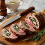 - Roast the beef: Preheat your oven to 350°F (175°C). Place the stuffed beef tenderloin on a roasting pan or rack. Roast in the oven for approximately 50 minutes, or until the internal temperature reaches about 135°F (57°C) for medium rare, adjusting time based on thickness and desired doneness.