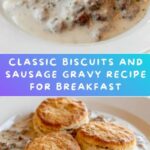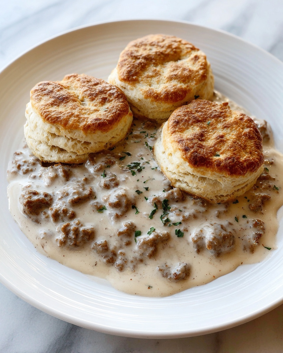 Classic Southern Biscuits and Sausage Gravy recipe featuring flaky homemade buttermilk biscuits topped with rich, creamy sausage gravy. This comforting dish is perfect for breakfast or brunch and serves 4 to 4 servings.