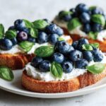 A delightful blend of sweet and savory flavors, Blueberry Basil Bruschetta features toasted French baguette slices topped with creamy ricotta, fresh blueberries, and aromatic basil, finished with a drizzle of balsamic glaze. Perfect as a light appetizer or snack, this Italian-inspired recipe combines fresh ingredients for a refreshing treat.