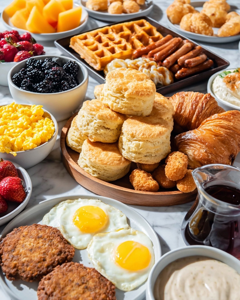 - Bread: biscuits, bagels, croissants, waffles, pancakes, or scones are essential vehicles for all the toppings and add inviting textures.