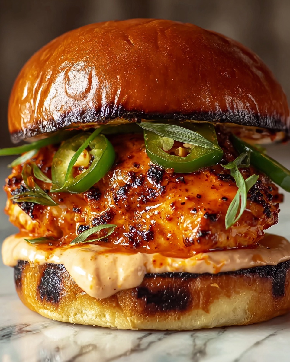 - Assemble the Burgers: Toast the hamburger buns until golden brown. Spread ranch or blue cheese dressing on the bottom buns. Place the cooked chicken patties on top, then layer with thinly sliced jalapeños and optional lettuce, tomato, and red onion. Top with the bun crown.