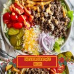 - Assemble the Bowls: Divide the chopped romaine lettuce evenly among four bowls. Layer each bowl with equal portions of cooked ground beef, halved grape tomatoes, thinly sliced red onion, dill pickle chips, crispy French fries, and shredded cheddar cheese.