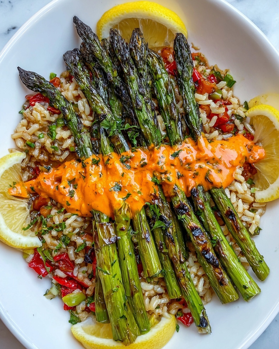 Charred Asparagus with Fresh Preserved Lemon Dressing is a bright and flavorful side dish featuring tender asparagus spears with beautiful char marks, enhanced by a tangy, garlicky preserved lemon dressing. Perfect for spring and summer meals, this recipe combines the smoky taste from grilling or broiling with the zesty freshness of preserved lemons and herbs, making a simple yet elegant accompaniment to any main course.
