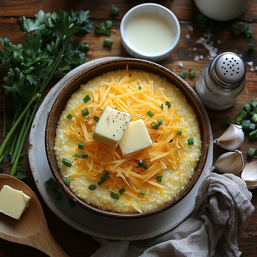 A creamy and comforting Cheese Grits recipe made with garlic, broth, milk, and sharp cheddar cheese. Perfect as a hearty side dish or breakfast staple, this recipe features stone-ground grits cooked to perfection with a rich, cheesy flavor and a hint of fresh herbs.