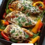 Place the coated chicken breasts neatly in a baking dish, then pile on those vibrant sliced bell peppers and onions. The veggies will roast alongside the chicken, softening tenderly and absorbing all the delicious spices.