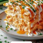 This Cheesy Buffalo Chicken Lasagna with Ranch Drizzle is a bold, flavorful twist on the classic Italian dish. Layers of tender lasagna noodles are filled with spicy Buffalo-coated shredded chicken, creamy ricotta mixture, and a blend of gooey mozzarella and cheddar cheeses. Classic Alfredo sauce adds a rich, smooth texture, while the finishing touch of a cool ranch drizzle and chopped green onions makes each bite irresistible. Perfect for game day or a comforting dinner with a kick.