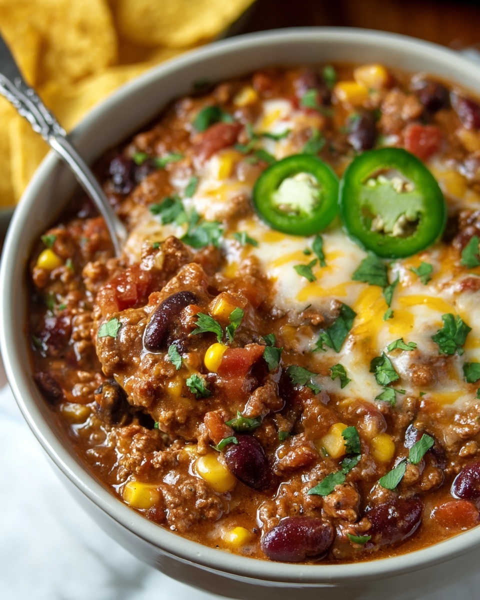 Cheesy Enchilada Chili is a flavorful and comforting dish that combines seasoned ground beef with creamy salsa con queso, tangy sour cream, and hearty ingredients like corn and beans. This easy-to-make chili is perfect for a cozy weeknight dinner and pairs wonderfully with tortilla chips or Fritos for a satisfying Tex-Mex-inspired meal.