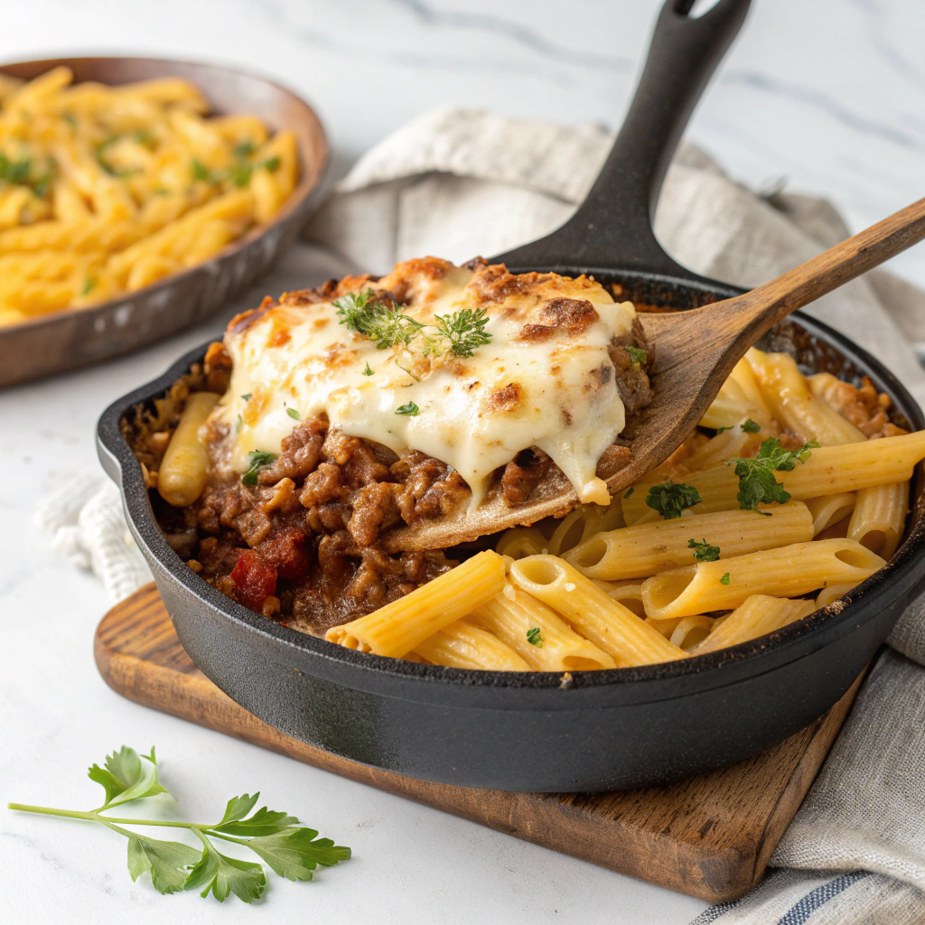 Now comes the fun part. Add the cooked pasta directly to your skillet, stirring to coat every piece in the luscious beef sauce. Sprinkle a generous layer of mozzarella cheese over the top and cover the skillet for just a few minutes — about 2 to 3 — until the cheese melts into a beautifully gooey blanket. Finish with a sprinkle of fresh parsley for a pop of color and freshness right before serving.