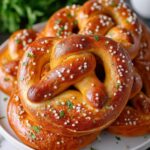 These chewy homemade soft pretzels are a delightful treat with a golden-brown crust and a soft, tender interior. Perfectly boiled in baking soda water for that signature pretzel texture and topped with coarse sea salt, these pretzels are a fun and rewarding baking project that yields 8 delicious, snack-worthy pretzels.