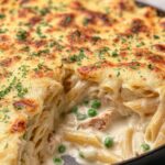 This comforting Chicken Alfredo Casserole combines tender cooked chicken, creamy Alfredo sauce, and perfectly cooked pasta baked to cheesy perfection. With a blend of mozzarella and Parmesan cheeses, seasoned chicken, and optional peas for a pop of color and nutrition, this casserole is an easy, satisfying meal perfect for family dinners.