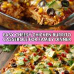 This Chicken Burrito Casserole is a hearty, flavorful baked dish perfect for a comforting family dinner. Layers of shredded chicken, black beans, corn, diced tomatoes with green chiles, rice, and creamy taco-seasoned sauce are baked between pieces of flour tortillas and topped with melted Mexican blend cheese. It’s easy to prepare, packed with Tex-Mex flavors, and garnished with fresh cilantro and green onions for a vibrant finish.