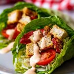 If you’re serving these wraps at a party or gathering, these Chicken Caesar Salad Lettuce Wraps Recipe can be cut into smaller bite-sized portions and arranged beautifully on a platter with fresh herbs sprinkled on top. You can also serve the wraps open-faced on a square plate for a more sophisticated look that lets all the colorful ingredients shine through.