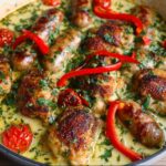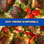 Chicken Scarpariello is a classic Italian-American dish featuring crispy bone-in chicken thighs and drumsticks simmered with garlic, bell peppers, pickled cherry peppers, white wine, and herbs. This vibrant skillet meal delivers a perfect balance of spicy, tangy, and savory flavors, making it a hearty and comforting main course.