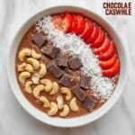 - Serve and Top: Pour the blended smoothie mixture into a bowl. Add your chosen toppings such as cashews, fresh strawberries, coconut flakes, and dark chocolate chunks to add texture and enhance the chocolate-cashew flavor profile.