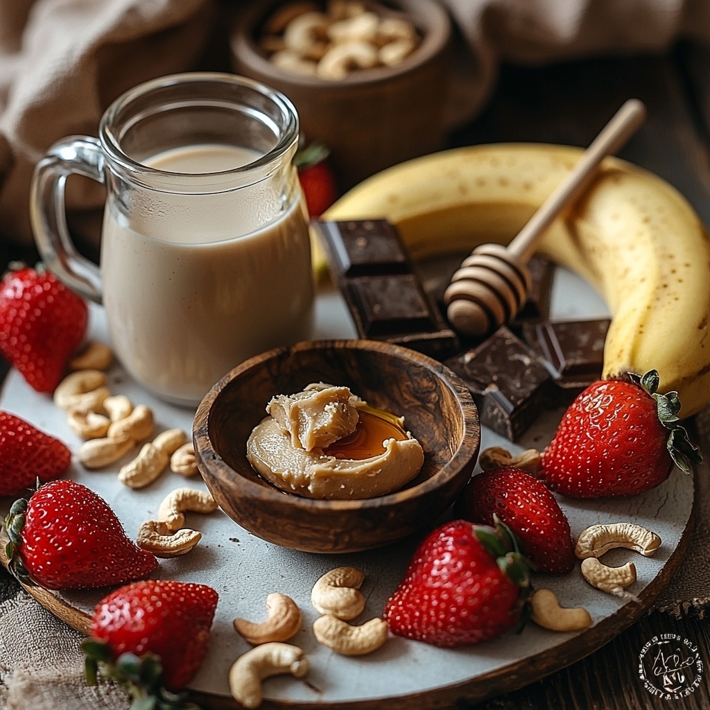 Start by grabbing 1 medium frozen banana, 1 cup of your choice of milk, ½ cup of fresh strawberries, 2 tablespoons of creamy cashew butter, 1 teaspoon of honey, and 1 tablespoon of cocoa powder. Having everything measured and ready makes the blending process smooth and fun.