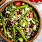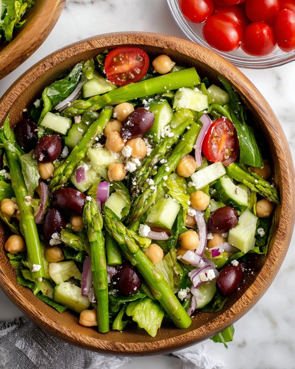 A fresh and vibrant chopped asparagus and chickpea salad featuring crisp mixed greens, juicy grape tomatoes, cucumbers, kalamata olives, and crumbled feta cheese, all tossed in a zesty lemon-oregano dressing. This quick and nutritious salad offers a perfect balance of flavors and textures, ideal for a light lunch or a healthy side dish.