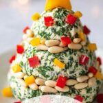 This festive Christmas Cheese Tree is a delightful and visually stunning holiday appetizer made from a blend of cream cheese, shredded cheddar, and flavorful seasonings. Shaped into a cone resembling a Christmas tree and decorated with parsley, pine nuts, and bell pepper ‘ornaments’, it’s a crowd-pleasing centerpiece perfect for holiday gatherings served with assorted crackers.