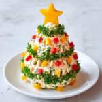 This festive Christmas Cheese Tree is a delightful and visually stunning holiday appetizer made from a blend of cream cheese, shredded cheddar, and flavorful seasonings. Shaped into a cone resembling a Christmas tree and decorated with parsley, pine nuts, and bell pepper ‘ornaments’, it’s a crowd-pleasing centerpiece perfect for holiday gatherings served with assorted crackers.