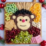 Surround the reindeer face with a vibrant bed of sliced kiwi, offering a fresh and tangy contrast that balances the sweetness. Tuck juicy grapes and bright orange slices into the corners to complete a colorful, holiday-inspired palette that invites guests to snack happily from all angles.