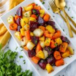 This festive Christmas Roasted Root Vegetables recipe features a colorful medley of butternut squash, beets, and rainbow carrots, tossed in melted ghee and perfectly seasoned with kosher salt, then roasted to tender, caramelized perfection. It makes an excellent side dish for holiday meals, bringing warmth, sweetness, and vibrant colors to your table.