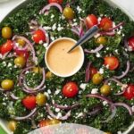 Now for the magical presentation! Arrange the dressed kale in a circle around the small bowl of dressing on a large plate, mimicking the shape of a Christmas wreath. Then, decorate your edible wreath evenly with cherry tomatoes, green olives, sliced red onions, and crumbled feta cheese. This creates a colorful, festive look that’s as joyful to see as it is to eat.