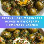 This refreshing Citrus Herb Marinated Olives recipe features a vibrant medley of green and black olives infused with fresh herbs, zesty lemon and orange peel, and garlic, all marinated in rich extra virgin olive oil. Paired with creamy, homemade labneh, it creates an irresistible appetizer perfect for any occasion.