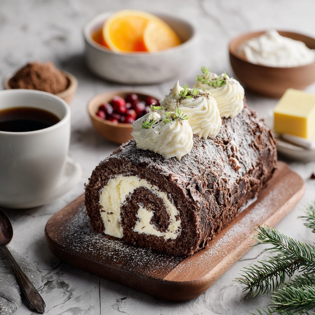 This Classic Yule Log Cake (Bûche de Noël) is a festive and elegant Christmas dessert that features a rich, tender chocolate sponge rolled with creamy whipped filling and covered in a smooth chocolate buttercream frosting. Garnished with seasonal touches like cranberries, meringue mushrooms, and rosemary, this cake is perfect for holiday celebrations and impresses with both flavor and presentation.