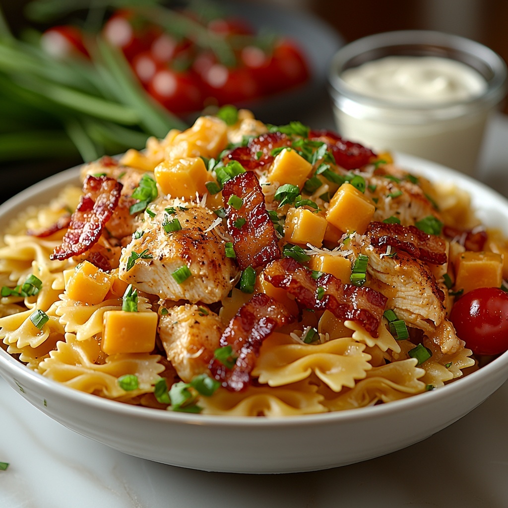 - Combine Ingredients: To the bowl of pasta, add the sliced chicken, crumbled cooked bacon, cubed cheddar cheese, chopped green onions, halved cherry tomatoes, and ranch dressing. Toss everything together until well combined. Taste and adjust seasoning with salt and pepper as needed.