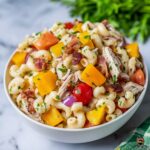 In the big bowl holding your pasta, add the cubed chicken, crumbled bacon, cheddar cheese cubes, sliced green onions, and halved cherry tomatoes. Pour in the ranch dressing and toss everything together gently but thoroughly. The dressing acts like the glue, binding all those delicious ingredients with a creamy touch. Don’t forget to season with a pinch of salt and pepper to taste for that final flavor boost.