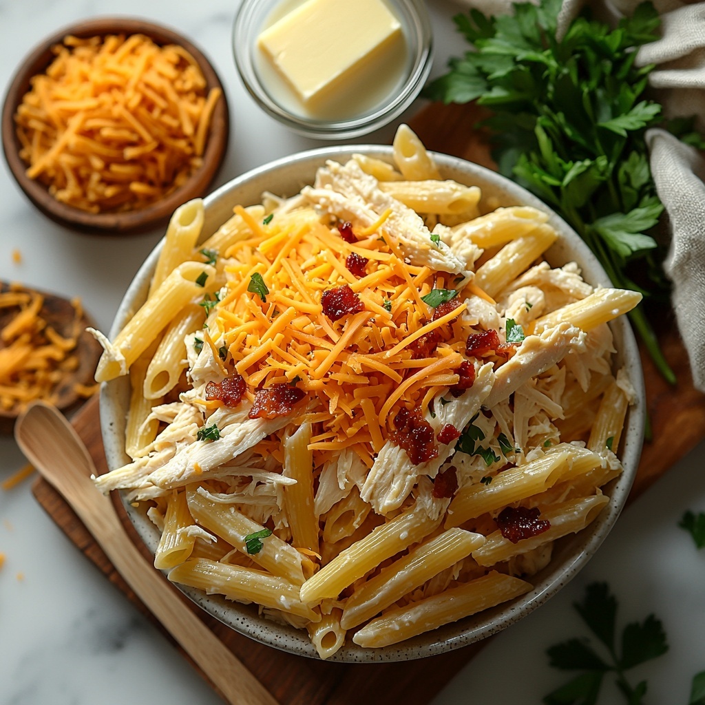 Crack Chicken Penne is a rich and creamy pasta dish combining tender shredded chicken, crispy bacon, and a flavorful ranch cheese sauce. This comforting recipe features penne pasta tossed in a cheesy blend of cream cheese, cheddar, and ranch seasoning, baked to bubbly perfection and garnished with fresh parsley for a deliciously indulgent meal.