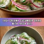 This Creamy Cucumber Salad is a refreshing and easy-to-make side dish perfect for summer. Featuring thinly sliced English cucumbers and red onions tossed in a tangy and creamy dill dressing made with sour cream and mayonnaise, this salad is chilled to meld flavors and deliver a crisp, satisfying bite with every forkful. It’s a versatile accompaniment that pairs well with grilled dishes or can be enjoyed on its own as a light snack.
