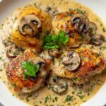 This Creamy Garlic Mushroom Chicken Thighs recipe features tender, bone-in chicken thighs cooked to perfection with a crispy skin, simmered in a rich and velvety garlic mushroom cream sauce infused with fresh herbs. It’s a comforting and elegant one-pan dish perfect for a hearty weeknight dinner or a special occasion.