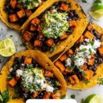 These Crispy Chipotle Sweet Potato Tacos with Lime Crema are a flavorful and satisfying vegetarian dish featuring roasted sweet potatoes seasoned with smoky chipotle and spices, combined with black beans, poblano peppers, and topped with a zesty lime crema and fresh cilantro. Perfect for a healthy and delicious meal that is gluten-free and packed with vibrant flavors.