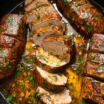 Reheat leftovers gently in a covered skillet over medium-low heat or in the microwave, adding a splash of broth or water to keep the pork tender and juicy. Alternatively, return the slices to the crockpot on low with some of the reserved sauce and warm through slowly without drying out the meat.