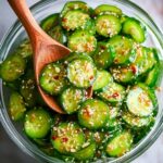A refreshing and light cucumber salad tossed in a savory soy, ginger, and garlic dressing. This easy-to-make no-cook dish features thinly sliced cucumbers marinated with a flavorful dressing and garnished with sesame seeds and fresh herbs, perfect as a side or a healthy snack.