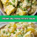 A tangy and creamy Dill Pickle Potato Salad combining tender baby potatoes, crunchy dill pickles, boiled eggs, and a flavorful dressing made with mayonnaise, sour cream, and Dijon mustard. Perfectly seasoned with fresh dill and spices, this potato salad makes a refreshing side dish for picnics, barbecues, or family dinners.