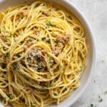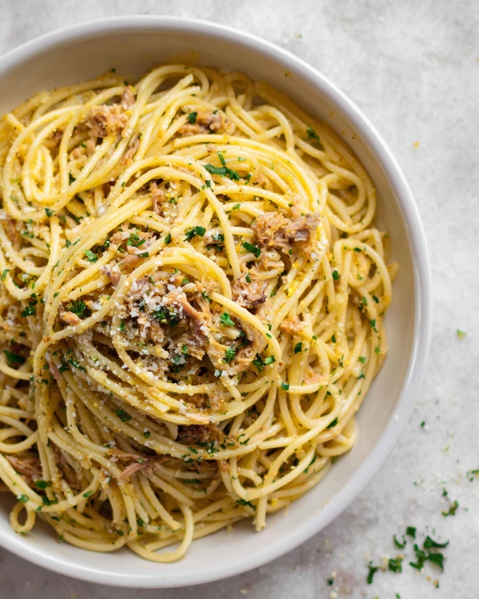 Next, stir in the drained tuna, lemon juice, and chopped parsley. Let the mixture warm through gently while the pasta finishes cooking. This step allows the tuna to soak up the lemon’s brightness and the herb’s freshness.