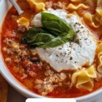 This Easy Lasagna Soup combines all the classic flavors of traditional lasagna into a comforting, hearty soup. Featuring ground beef or Italian sausage, crushed tomatoes, aromatic herbs, and tender pasta, it’s topped with creamy ricotta and melted mozzarella, garnished with fresh basil for a satisfying meal perfect for any day of the week.