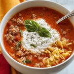 This Easy Lasagna Soup combines all the classic flavors of traditional lasagna into a comforting, hearty soup. Featuring ground beef or Italian sausage, crushed tomatoes, aromatic herbs, and tender pasta, it’s topped with creamy ricotta and melted mozzarella, garnished with fresh basil for a satisfying meal perfect for any day of the week.