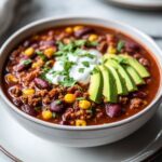 A sprinkle of fresh cilantro or parsley adds a pop of color and freshness that brightens the rich chili. Shredded cheddar or pepper jack cheese melts delightfully on top, while a dollop of sour cream or Greek yogurt brings a cool creaminess that balances the spices beautifully.