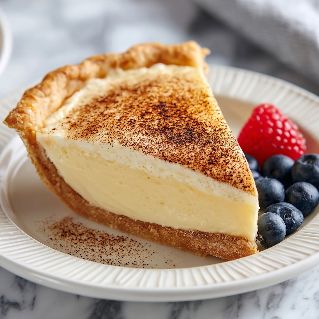 A classic and creamy Egg Custard Pie featuring a smooth custard made from eggs, milk, and aromatic nutmeg, baked to perfection in a flaky pre-made pie crust. This comforting dessert offers a delicate sweetness complemented by vanilla and a beautiful glossy crust finish from an egg wash.