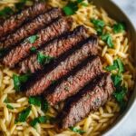 For a more formal presentation, serve the steak sliced over the orzo on a large platter, garnished with thyme sprigs and drizzle some balsamic glaze for a pop of flavor and visual appeal. You can also build individual plates layering the orzo first, topping with steak slices, and finishing with a sprinkle of fresh herbs for a restaurant-style experience at home.