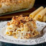 Place your cooked pasta into the ungreased baking dish and pour the sumptuous cheese sauce over it, ensuring every noodle is coated with cheesy bliss. Sprinkle the panko topping evenly on top and slide the dish into the oven. Bake for 20 to 25 minutes until the breadcrumbs turn a gorgeous golden brown and the cheese sauce bubbles invitingly beneath. Serve hot for maximum indulgence.
