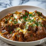 This French Onion Beef Casserole is a comforting and hearty dish featuring tender beef chuck roast slow-cooked with caramelized onions, garlic, and aromatic thyme in a rich beef broth. Topped with melted Gruyère and mozzarella cheeses, this casserole offers a savory and cheesy finish, perfect for a satisfying family meal or special occasion. The dish combines the classic flavors of French onion soup with tender braised beef and a cheesy baked topping.